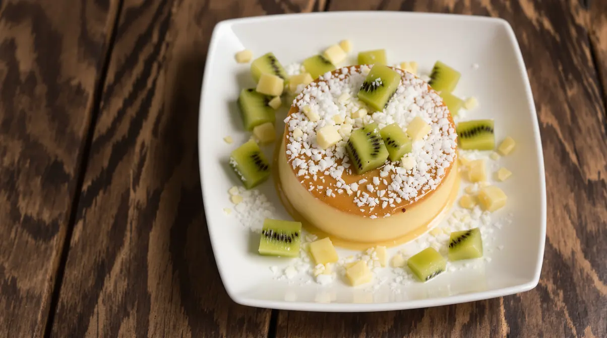 Ce dessert garde les codes du flan antillais : noix de coco, vanille, texture fondante et parfum d’ailleurs. Pourtant, sa composition change vraiment.